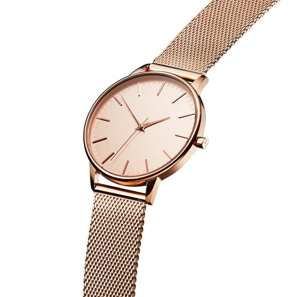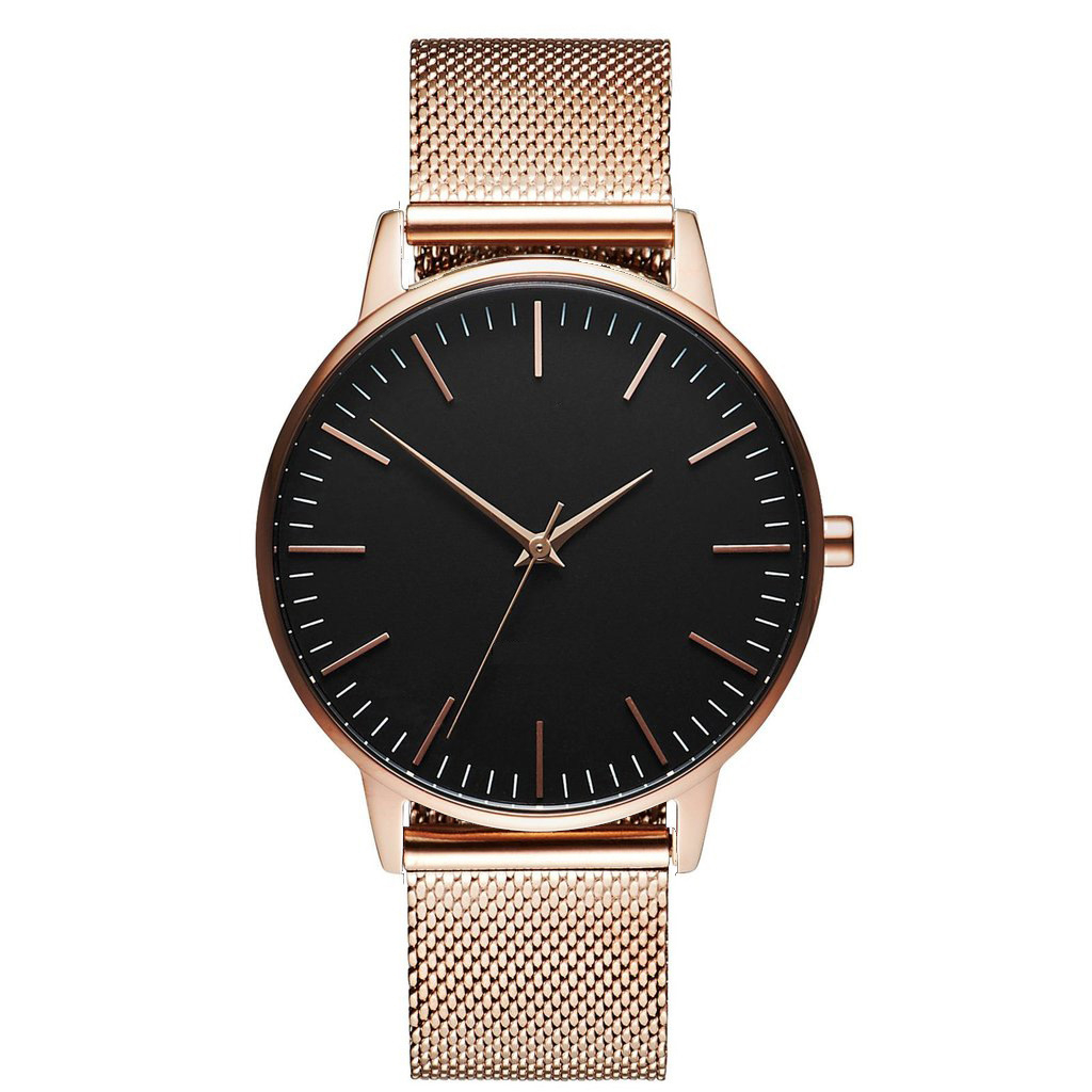 Colors: Rose gold with a black dial and a rose-gold mesh strap; rose gold with a rose-gold dial and a rose-gold mesh strap; rose gold with a white dial and a rose-gold mesh strap; silver with a white dial and a silver mesh strap; silver case with a black dial and a silver mesh strap; light gold with a black dial and a light-gold mesh strap; light gold with a white dial and a light-gold mesh strap; black case with a black dial and a black mesh strap.